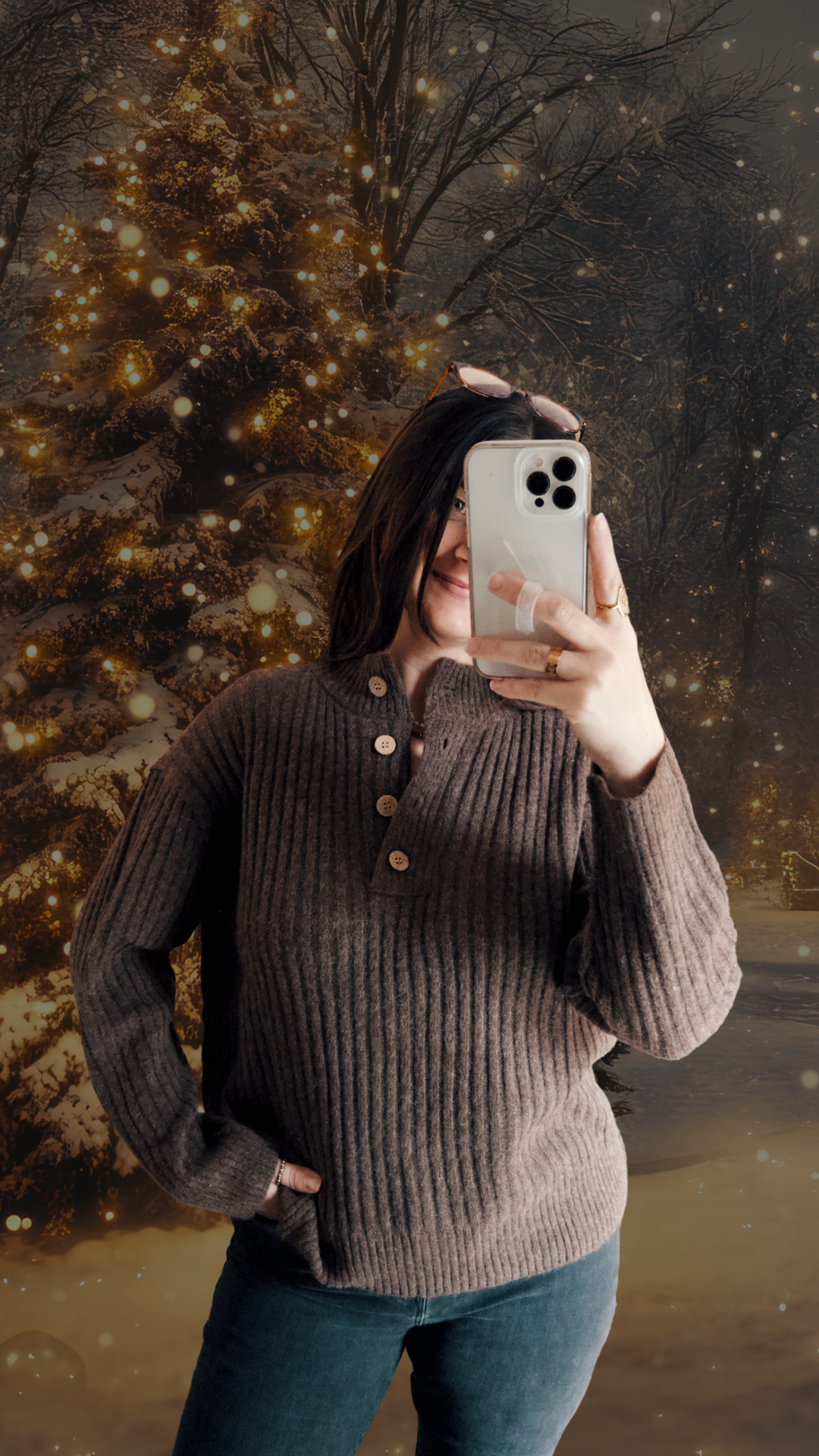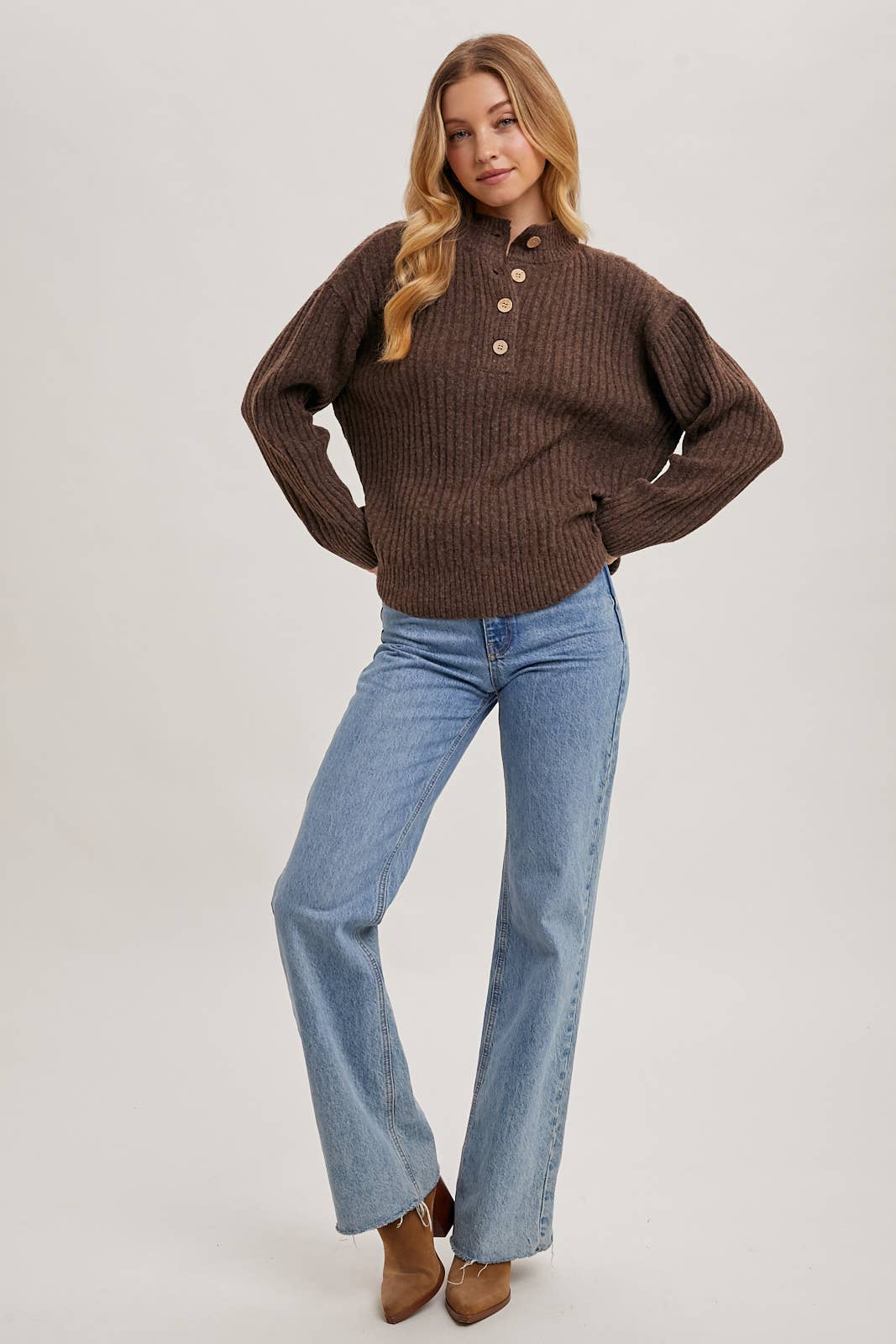 A Henley neck button-front knit sweater pullover combines classic design with casual comfort. This pullover features a Henley neckline, distinguished by a short button placket that extends from the neck down to the chest, adding a subtle touch of detail and the option to adjust the neckline to your preference. The knit material offers warmth and a cozy feel, making it perfect for cooler weather. The sweater's pullover style ensures easy wear, and its relaxed fit makes it versatile for layering over a t-shirt or under a jacket. This Henley neck sweater is a timeless piece that can be paired with jeans for a laid-back look or dressed up with slacks for a more polished outfit. -Model is 5'9" and wearing a S/M