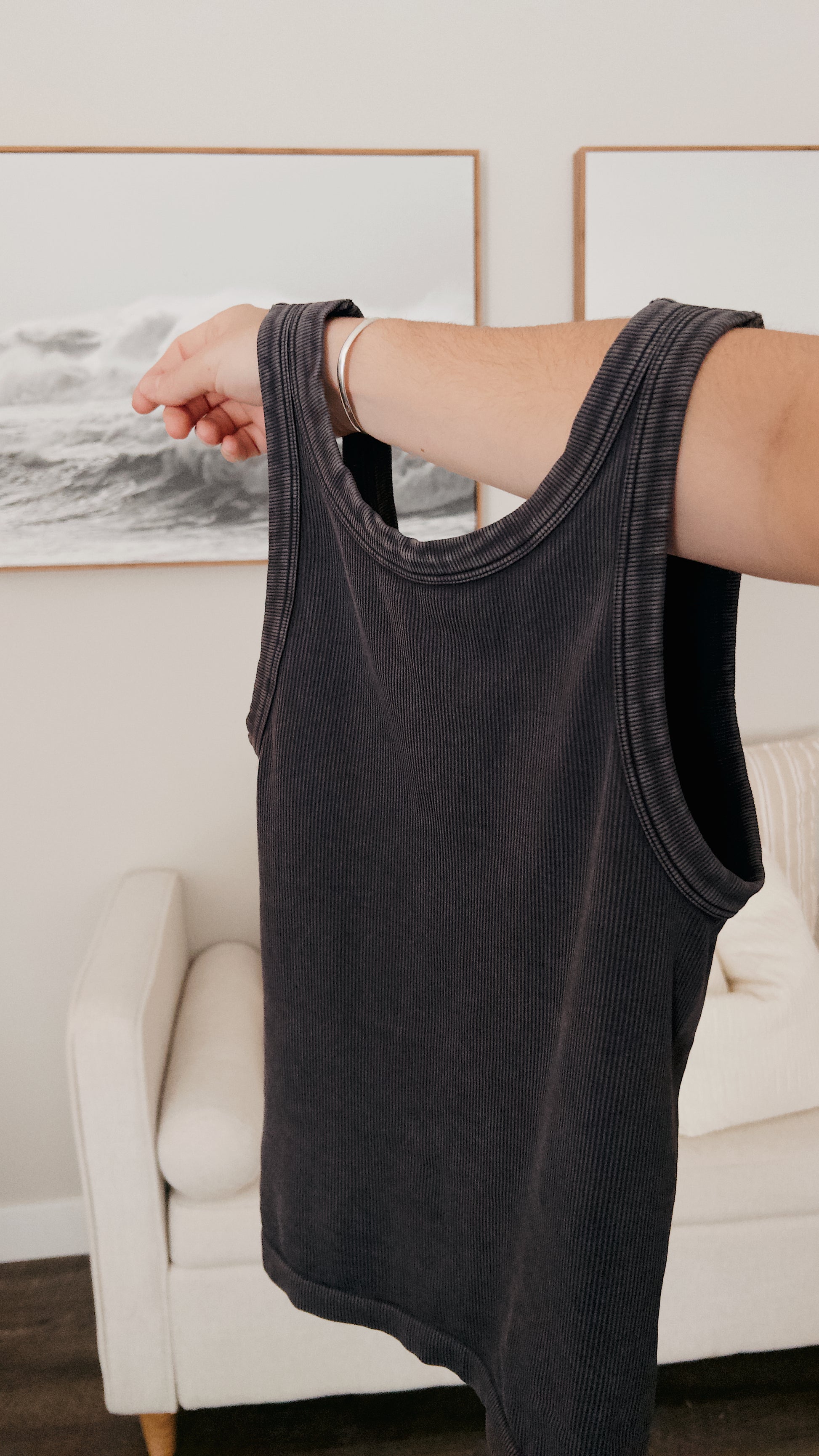 Size: One Size. Fits XS-XL. A reversible ribbed tank top that can be worn as a scoop neck or turned around to be worn as a crew neck. Fabric: 92% Nylon / 8% Spandex. Made in the USA. A must to add to your essentials wardrobe.